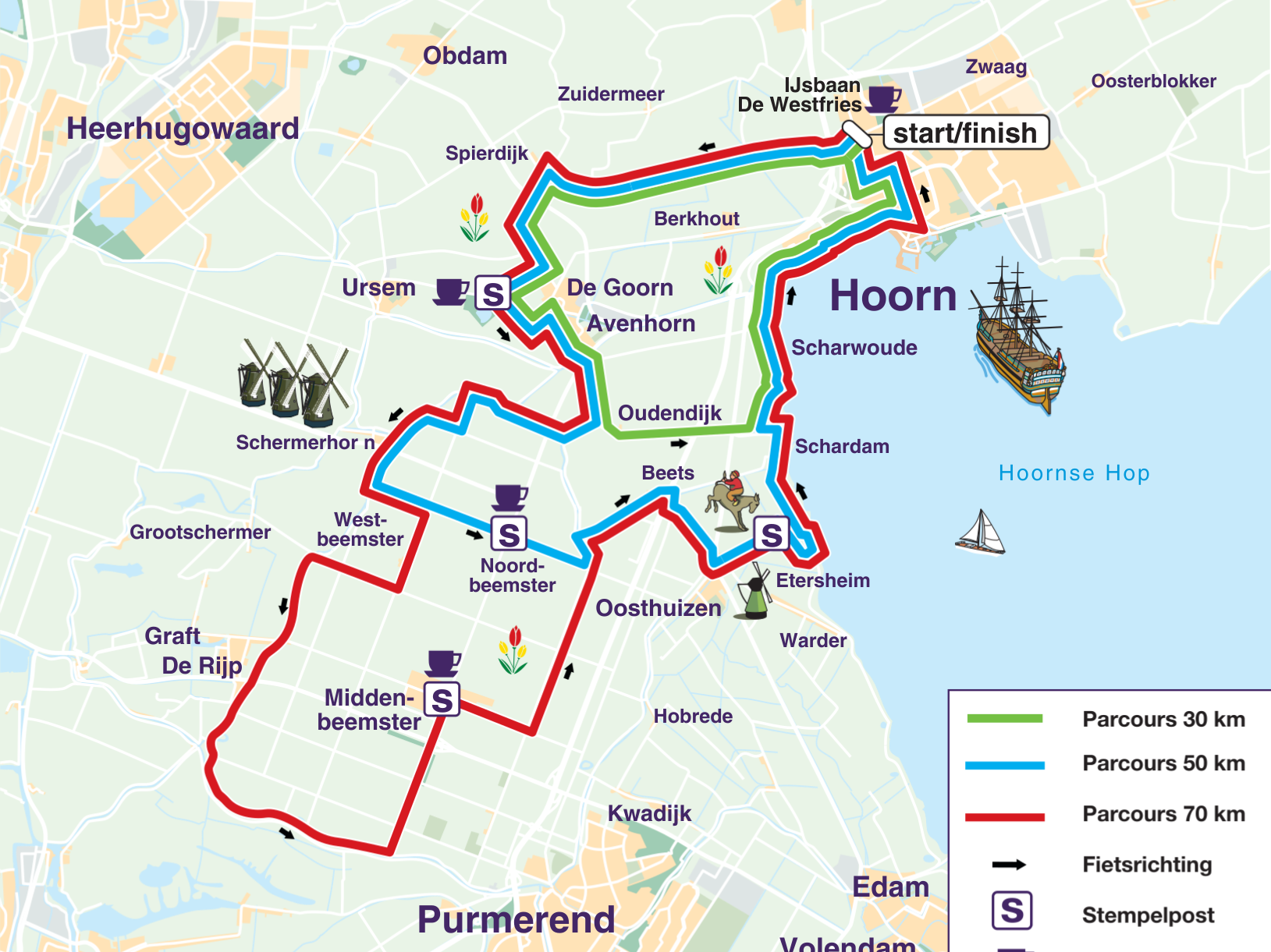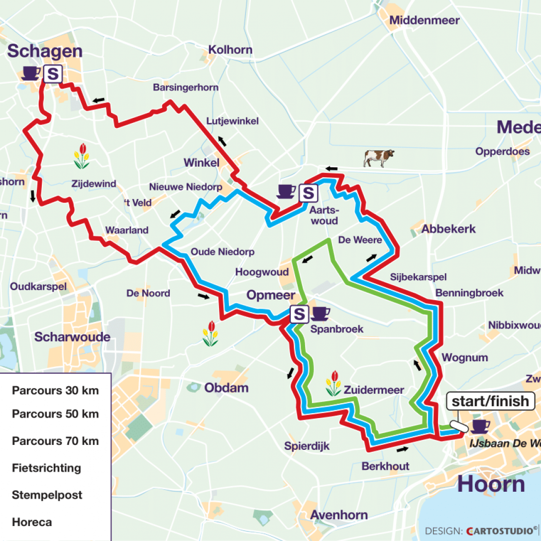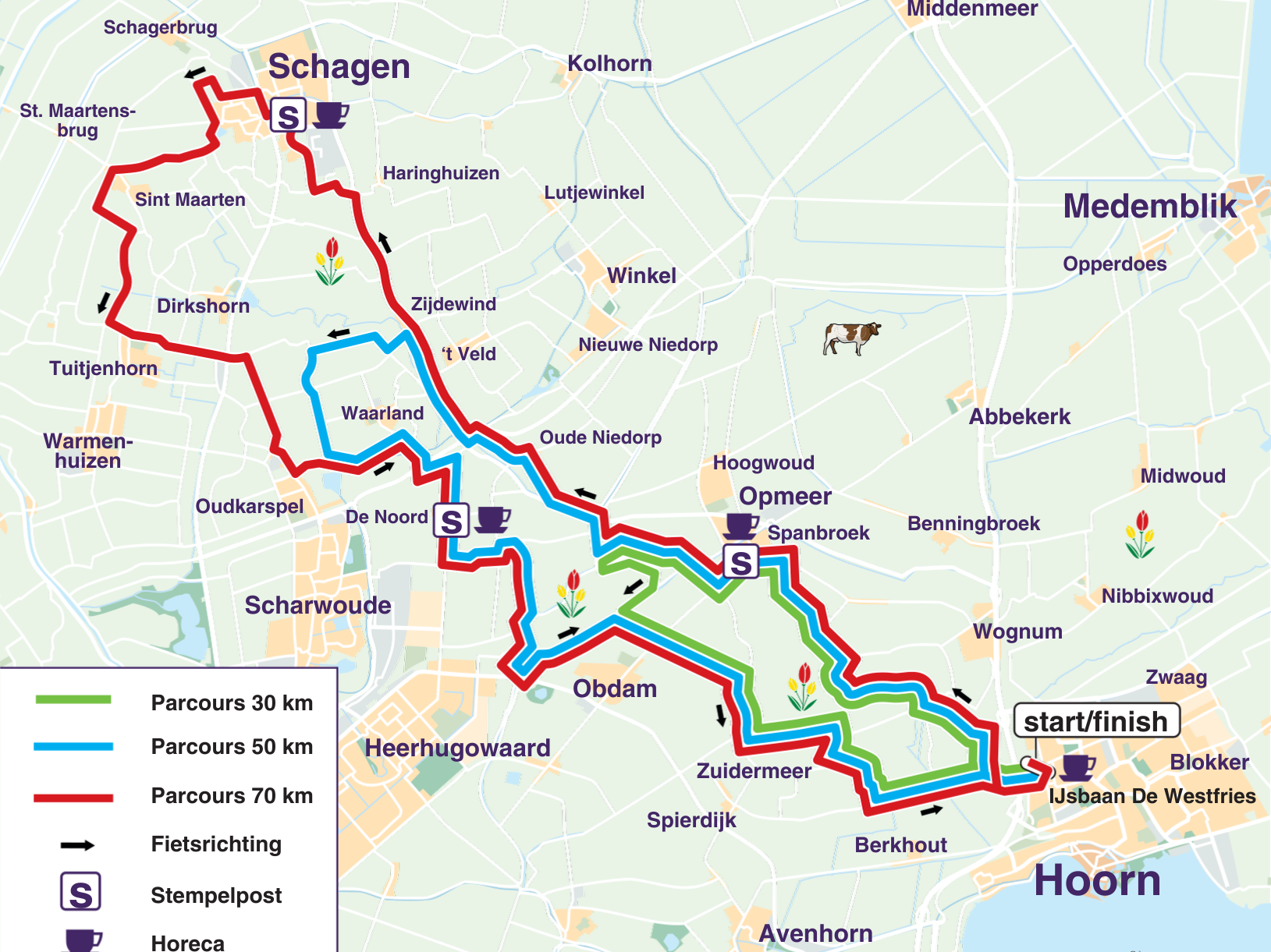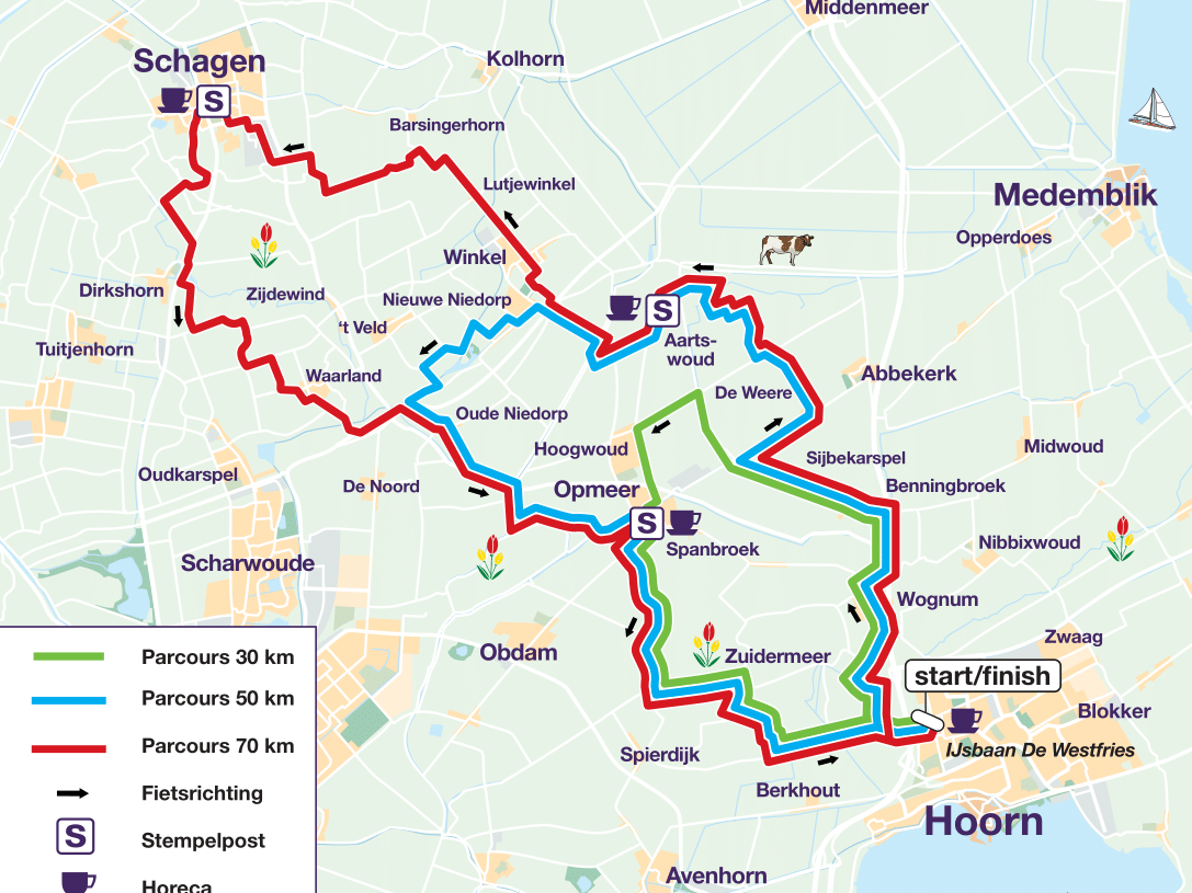 De Fiets4Daagse Hoorn 2026 vindt van 29 april t/m 2 mei plaats. De routes van deze Fiets4Daagse liggen als een klaverblad in en rondom Hoorn en laten je kennis maken met de regio Westfriesland. In vier thema’s leiden we je door het prachtige landschap. De Tulpenroute, de Zuiderzeeroute, de Westfrieslandroute en de Beemsterroute verrassen je elke dag met mooie en bijzondere passages! Vind jij vier dagen fietsen net even te veel? Kies er dan voor om één of meerdere Fiets1Daagse-tickets aan te schaffen!