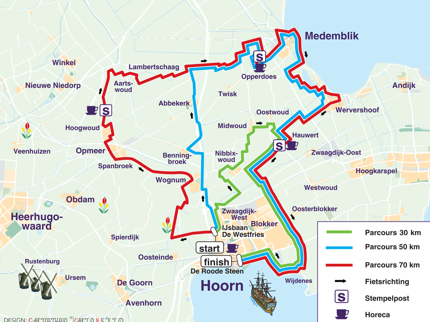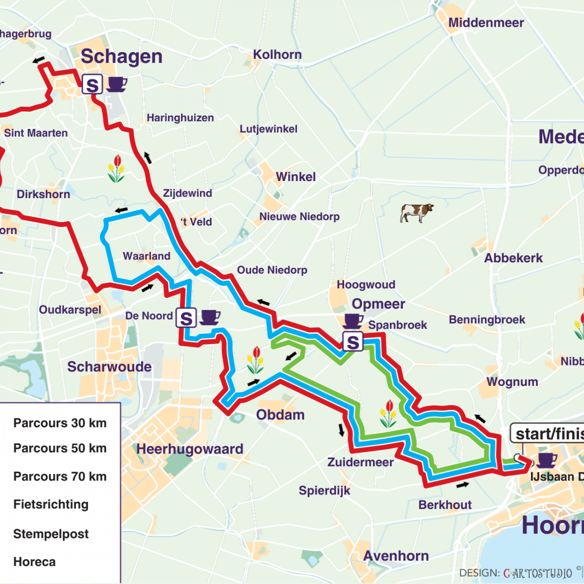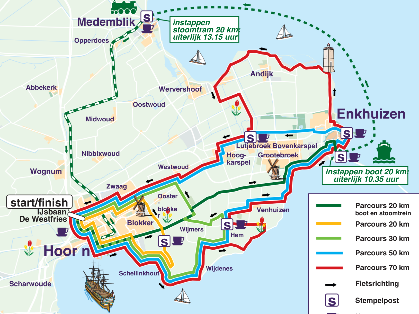 De Fiets4Daagse Hoorn 2026 vindt van 29 april t/m 2 mei plaats. De routes van deze Fiets4Daagse liggen als een klaverblad in en rondom Hoorn en laten je kennis maken met de regio Westfriesland. In vier thema’s leiden we je door het prachtige landschap. De Tulpenroute, de Zuiderzeeroute, de Westfrieslandroute en de Beemsterroute verrassen je elke dag met mooie en bijzondere passages! Vind jij vier dagen fietsen net even te veel? Kies er dan voor om één of meerdere Fiets1Daagse-tickets aan te schaffen!